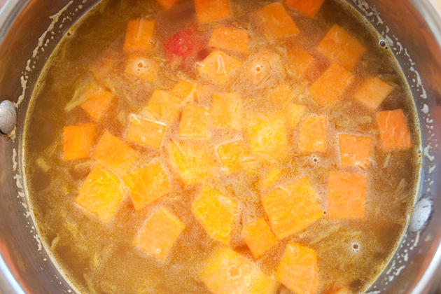 I sauteed my onions, garlic, and carrots for 5-7 minutes or until the onions became translucent. I added the sweet potato chunks and red peppers and sauteed for another minute.