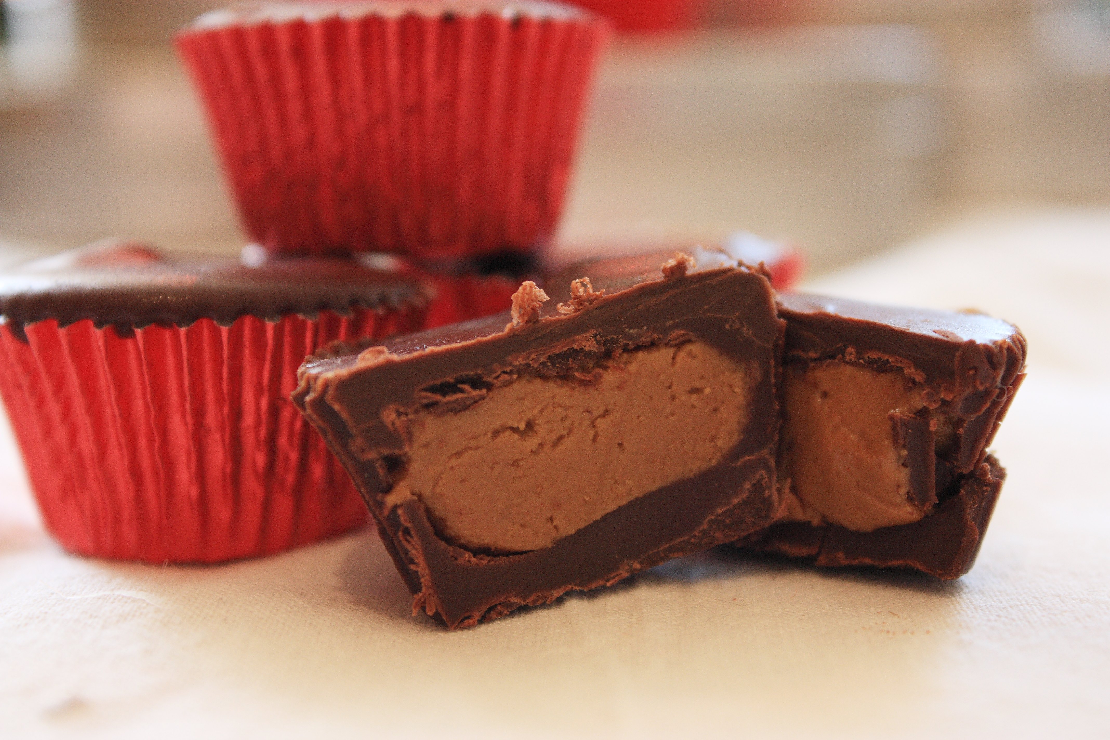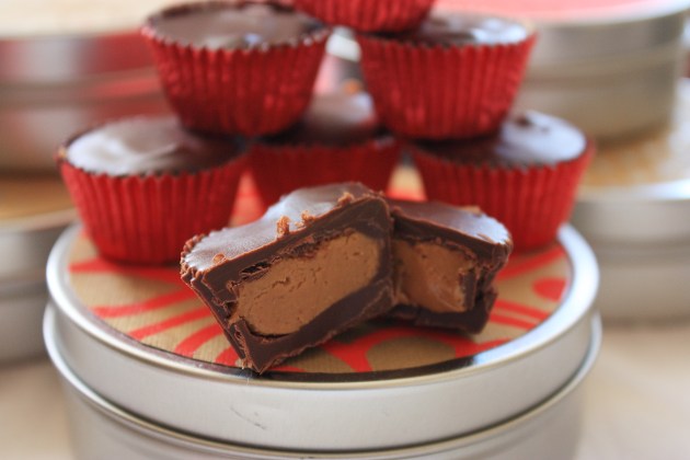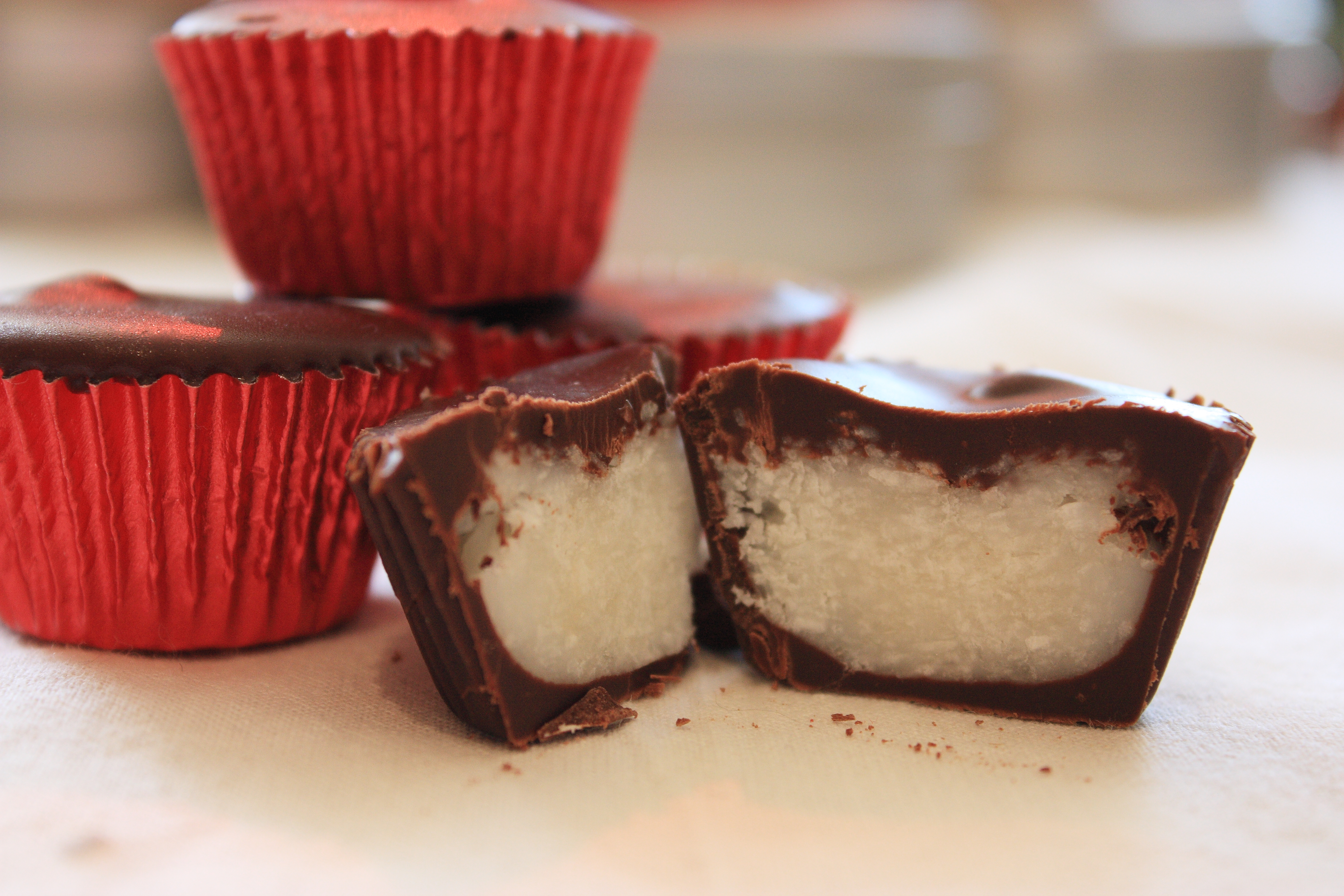Melt Chocolate and Assemble: Melt the chocolate chips and vegetable shortening in a small heavy bottom pan over the stove until completely smooth. With a mini spoon, other small utensil, or paintbrush paint the inside of the paper muffin cups with the melted chocolate. Make sure to coat every nook and cranny so that there are no holes. Place the cup in the muffin tin so that it retains it’s shape. Once you’ve coated as many cups that the mold holds with chocolate, place the pan in the freezer for 3-5 minutes until the chocolate has completely hardened. Remove from the freezer and spoon the sunbutter or coconut filling into each of the cups. Then cover each cup with your melted chocolate. Refrigerate until hardened. They can be stored this way for several weeks (and probably months, but they’re not likely to last long enough to test that theory). Also, I had to do many batches since my tin only held 12 cups at at time and I didn’t need to remelt my chocolate through all of it, but if your chocolate does harden before you’re finished simply go ahead and remelt it.